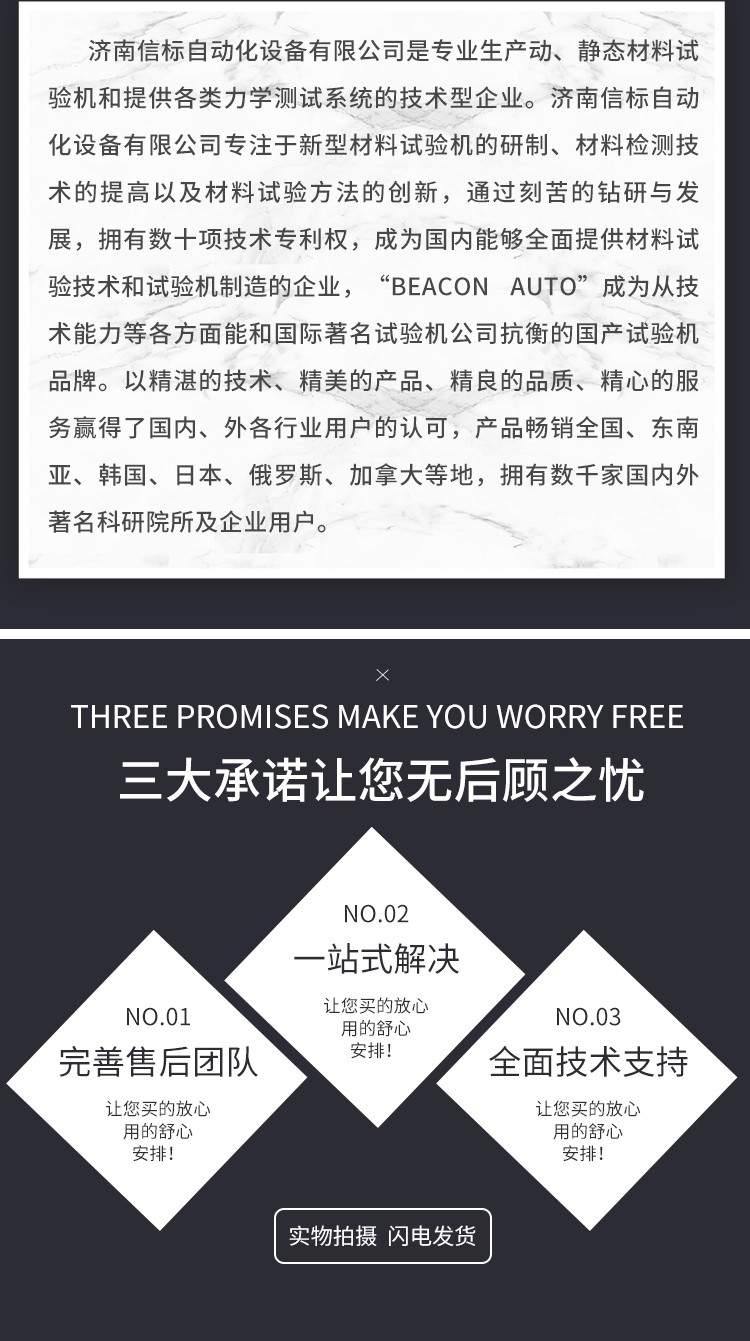測量參數: 1. 最大試驗力: 10/20/30/50kN 2. 試驗力測量范圍: 0.4%--100%。 3. 試驗力示值精度:優于示值±1% 4. 試驗力分辨力:1/500000 5. 橫梁位移測量精度:分辨率高于0.0025mm 6. 變形測量精度: ±0.5% 7. 試驗速度范圍:0.0002—500mm/min,無級調速 8. 速度控制精度:±1%(0.0002~50mm/min); ±0.5%(50~3500mm/min) 9. 恒力、恒變形、恒位移控制范圍: 0.2%-100%FS 10.恒力、恒變形、恒位移控制精度: 設定值<10%FS時,設定值的±1.0%以內 設定值≥10%FS時,設定值的±0.1%以內 11. 變形速率控制精度: 速率<0.05%FS時為±2.0%設定值內 速率≥0.05%FS時為±0.5%設定值內 12. 試驗空間: A.拉伸空間:1000mm B.壓縮空間:1100mm C.寬度:450mm 13.下工作臺:450*250 14. 壓盤尺寸:φ100 mm 15. 整機電源:單相,220V±10%,50Hz,功率:750 W 16. 工作環境:室溫—35℃,相對濕度不超過80% 17. 主機尺寸: 870×730×1750mm 18. 重量:400 kg 三、產品配置: 1、主機 一套 2、松下A7全數字伺服電機及伺服驅動器; 一套 3、高精度負荷傳感器; 5kn/1kn/500N/200/ 各一支 4、Hiwin精密滾珠絲杠; 2支 5、光電編碼器(2500線,內置); 1支 6、夾具:滿足海綿/汽車座椅所需工裝 1套(有多種) 7、三閉環測量系統一套,采用力,位移,應變等多種控制方式,試驗過程中可實時顯示力-位移,力-時間,應力-應變等多種試驗曲線,并可自動得出最大負荷,拉伸強度,斷裂伸長率等多種結果參數。 8、HP品牌計算機,21寸液晶顯示器; 9、打印機:HPA4彩色噴墨打印機; 10、專用試驗軟件:可執行GB,ISO,JIS、DIN,ASTM等多種試驗標準,全開放式,功能強大,方便操作,免費提供升級軟件,并可根據用戶需求自行編輯試驗軟件。