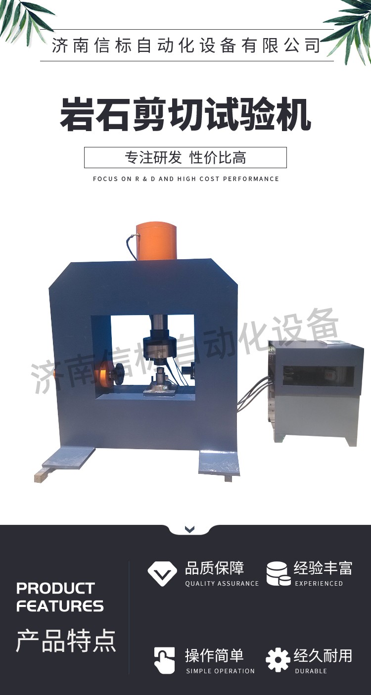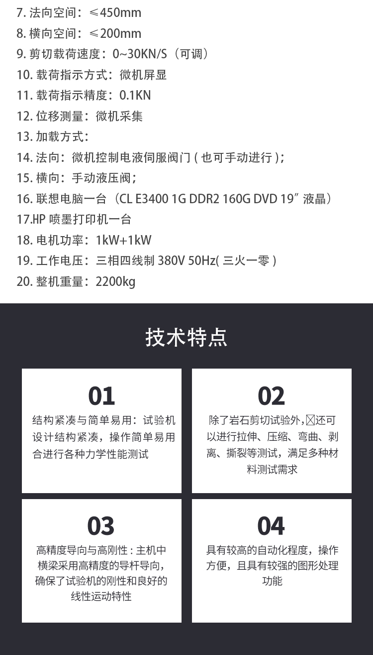 主要技術(shù)參數(shù): ?法向載荷:0~500kN ?法向過載保護:超滿負荷2% ?法向工作行程S:0~100mm ?橫向載荷:0~300kN ?橫向過載保護:超滿負荷2% ?橫向工作行程S:0~150mm ?法向空間 : ≤450mm ?橫向空間 : ≤200mm ?剪切載荷速度:0~30KN/S(可調(diào)) ?載荷指示方式:微機屏顯 ?載荷指示精度:0.1KN ?位移測量:微機采集 ?加載方式: ?法向:微機控制電液伺服閥門(也可手動進行); ?橫向:手動液壓閥; ?聯(lián)想電腦一臺(CL E3400 1G DDR2 160G DVD 19”液晶) ?HP噴墨打印機一臺 ?電機功率:1kW+1kW ?工作電壓:三相四線制 380V 50Hz(三火一零) ?整機重量:2200kg ?外形尺寸:1500×900×1735mm Equipment working conditions設備工作條件: 1.Power supply(電源):Three phase and Four wire(三相四線制); three live wire, one zero line(三火線一零線) 2.Wiring definition(接線定義):Brown - live wire, Yellow - live wire, Blue - live wire,Black – zero line 棕-火線,黃-火線,藍-火線,黑-零線; 3.Main motor power(主機功率):2.2kW(千瓦) Total; 4.Max . Normal load (最大法向力):500kN(千牛); 5.Max. Lateral load(最大橫向/剪切力):300kN(千牛); 6.hydraulic oil(液壓油):46# Hydraulic Oil@cold area or season; 68# Hydraulic Oil@hot area or season; 46#抗磨液壓油@寒冷地區(qū)或季節(jié);68#抗磨液壓油@炎熱地區(qū)或季節(jié); oil bearing(耗油量):40L(公升); 7.Weight of machine(主機重量):about 2000kg;約2噸; 8.在無震動環(huán)境中。 9.電源電壓波動范圍小于額定電壓的±10%。 10.地基應平整、牢固。 試機: 1.加油:油液采用46#號抗磨液壓油,加油孔在儀器左后方,將左后方蓋板打開,將油箱上方加油口保護罩打開,加油即可,油量在40L左右。 2.接電:請牢固連接三相電源,不可缺相。