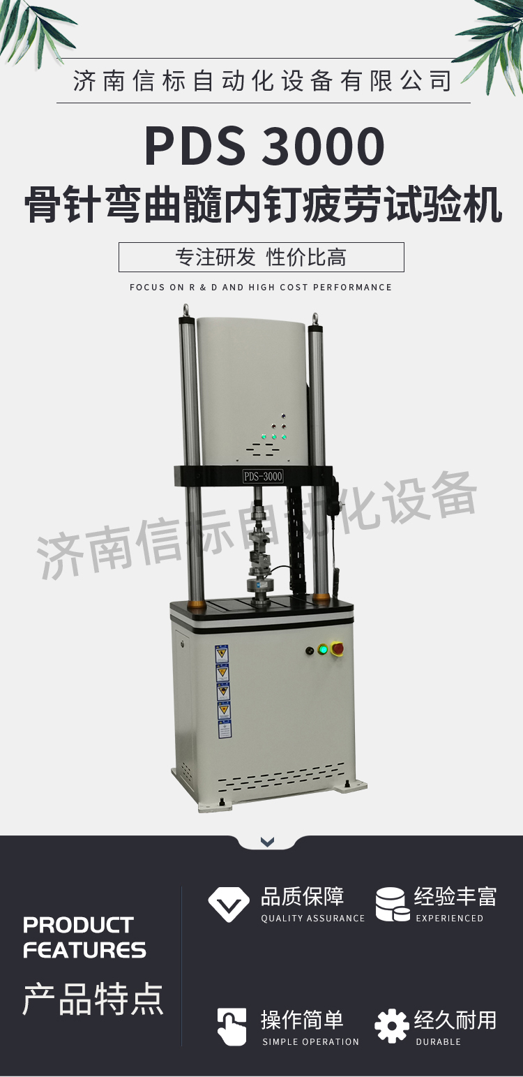 濟南信標自動化設備有限公司主要生產:動靜態萬能疲勞試驗機,接骨板彎曲試驗機,縫合線拉伸疲勞試驗機,髖膝關節磨損試驗機,電子萬能試驗機、液壓萬能試驗機、巖石三軸、四軸,電液拉力試驗機,材料試驗機,高低溫蠕變,高低頻疲勞,拉伸、扭轉、杯突等二十多個系列兩千多個的品種。